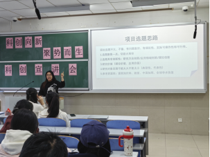 陈静怡同学以自身参赛经历为切入点,系统介绍了“挑战杯”、“建行杯”、师范生从业技能大赛等多项重要科创赛事的规则、流程与备赛重点,让同学们对各类科技创新赛事有了清晰且深入的认知。在问答环节,她耐心细致地解答同学们的疑问,以轻松亲切的互动进一步点燃了学院学子的参赛热情,现场交流踊跃,氛围热烈。